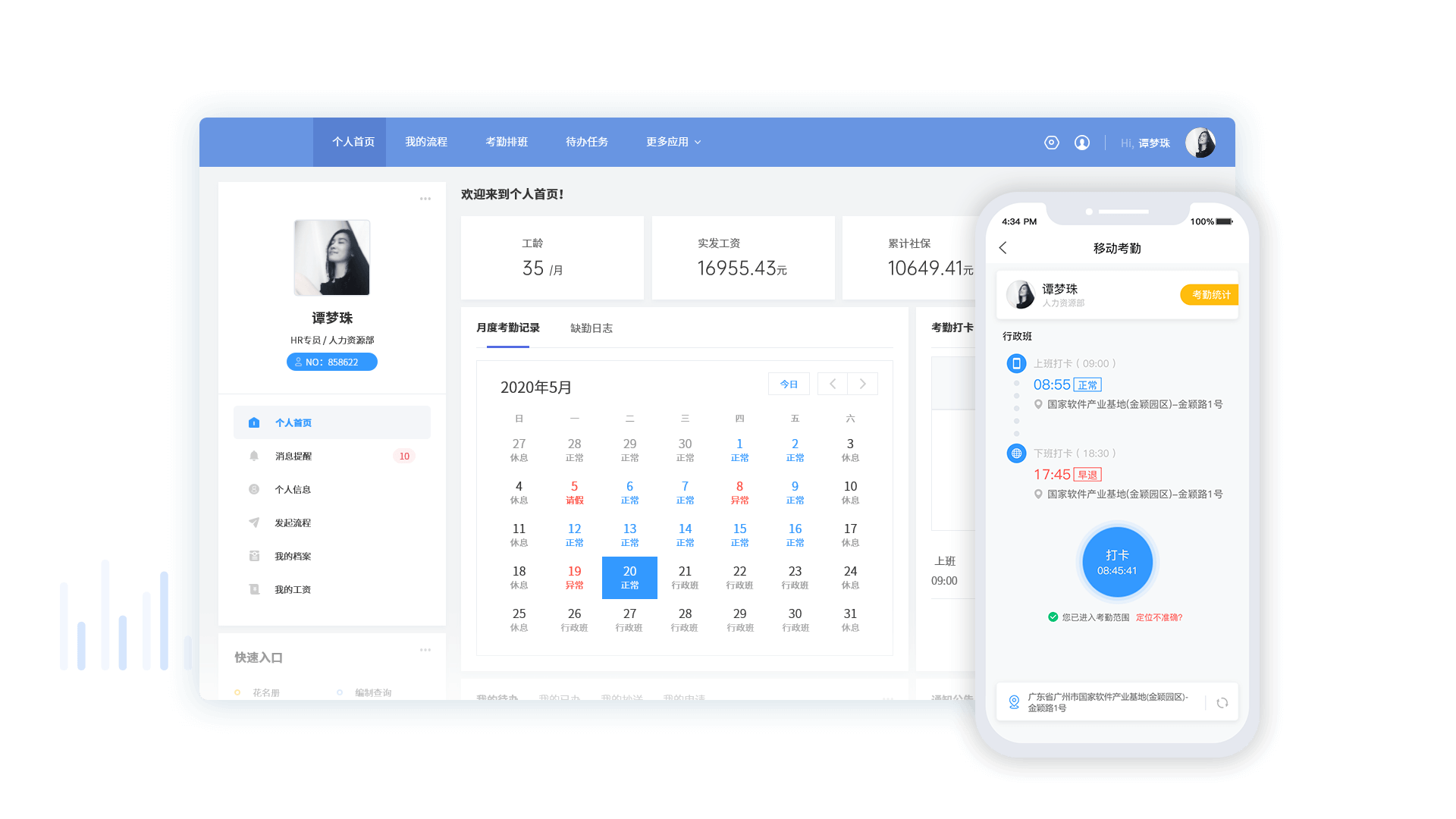• 灵活的智能考勤管理,可满足企业复杂的个性化考勤、加班、调休规则需求,实现部门、岗位及人员的考勤差异化管理,支持跨区域、多终端考勤数据实时统计,帮助企业轻松搞定涵盖考勤、工时、排班、假期、调班、劳动力智能分析在内的全方位考勤管理。